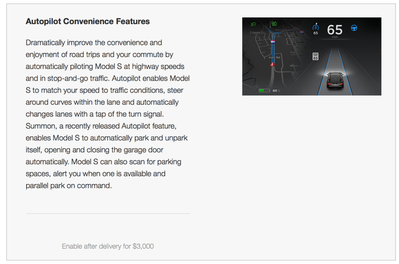 Currently, both Tesla's Model S and X come standard with safety-related autopilot features, such as blind spot warning and automatic emergency braking. Further, all Tesla vehicles include related hardware relevant to every available convenience-related autopilot features, which include automatic steering and lane changes on the highway. But customers must pay $2,500 to enable these convenience-related autopilot features, or $3,000 after delivery.