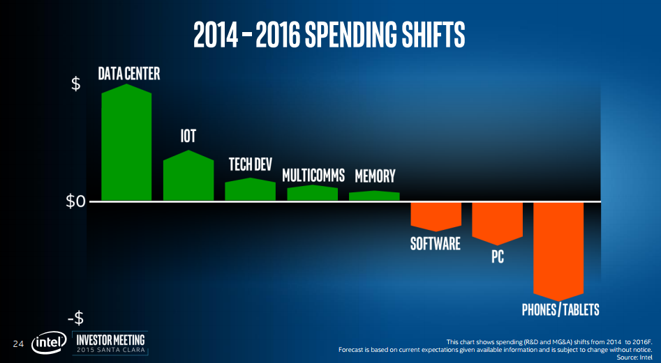 However, you'll notice that on this same slide, Intel indicates it's actually increasing its investments in multicomms slightly between 2014 and 2016. Multicomms refers to the actual wireless technology such as cellular baseband, Wi-Fi, NFC, and so on.