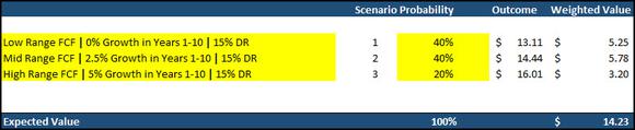 Let's look at the three scenarios using these various assumptions and see how we were able to arrive at a reasonably conservative estimate of intrinsic value using a range of values and probability of how the scenarios would play out: