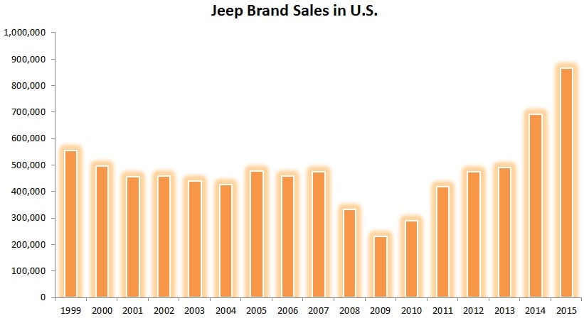 There's no question Jeep has been one intriguing story since Fiat Chrysler Automobiles made its debut on the New York Stock Exchange. Jeep has defied its critics, which have generated numerous quality studies suggesting the SUV brand significantly lags its competitors, with consumers continuing to drive the vehicles off dealership lots at a rapid pace. Just last month Jeep sales were up 23% compared to the previous year, marking an incredible 29 consecutive months of year-over-year sales gains. Look below to see its annual sales surge in the U.S., which currently generates the majority of global Jeep sales.