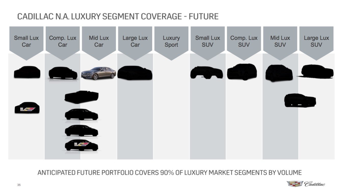 The "Mid Lux SUV" is the new XT5; the "Large Lux SUV" is the next-generation Escalade. There are three other Cadillac crossover SUVs set to arrive between now and 2020. Image source: General Motors.