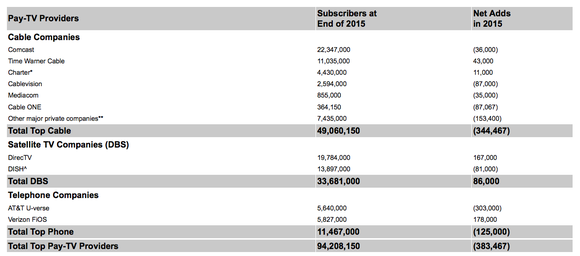 The top nine cable companies lost about 345,000 video subscribers in 2015, a major improvement from the 1,215,000 subscribers they shed the previous year, according to LRG. AT&T (T +0.73%) and Verizon (VZ +0.33%), by contrast, lost 125,000 video subscribers in 2015, after net gains of about 1,050,000 subscribers in 2014. It was the telco segment's worst performance since 2006, the research firm reported.