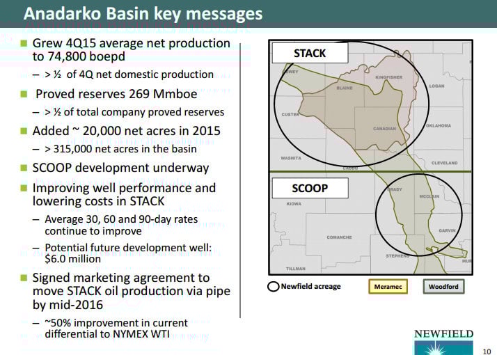 The STACK stands for the Sooner Trend Anadarko Basin Canadian and Kingfisher Counties and is an oil-rich shale play in northern Oklahoma. As the map on the slide below shows, the STACK play not only refers to its location but also to the fact that it's where the Meramec and Woodford shales are stacked on top of each other, which provides drillers with multiple layers to drill: