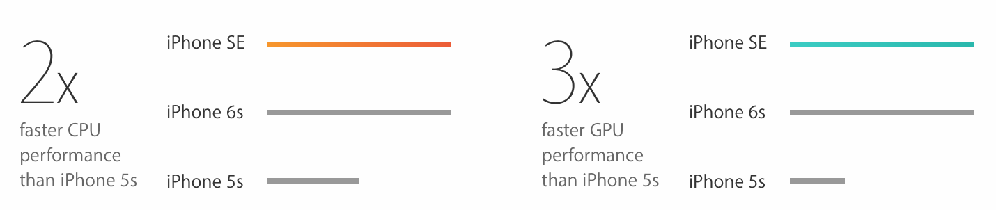 - CPU and GPU: The phone's A9 chip and M9 motion co-processer doubles the CPU performance of the iPhone 5s. Its GPU performance is three times faster than the iPhone 5s.