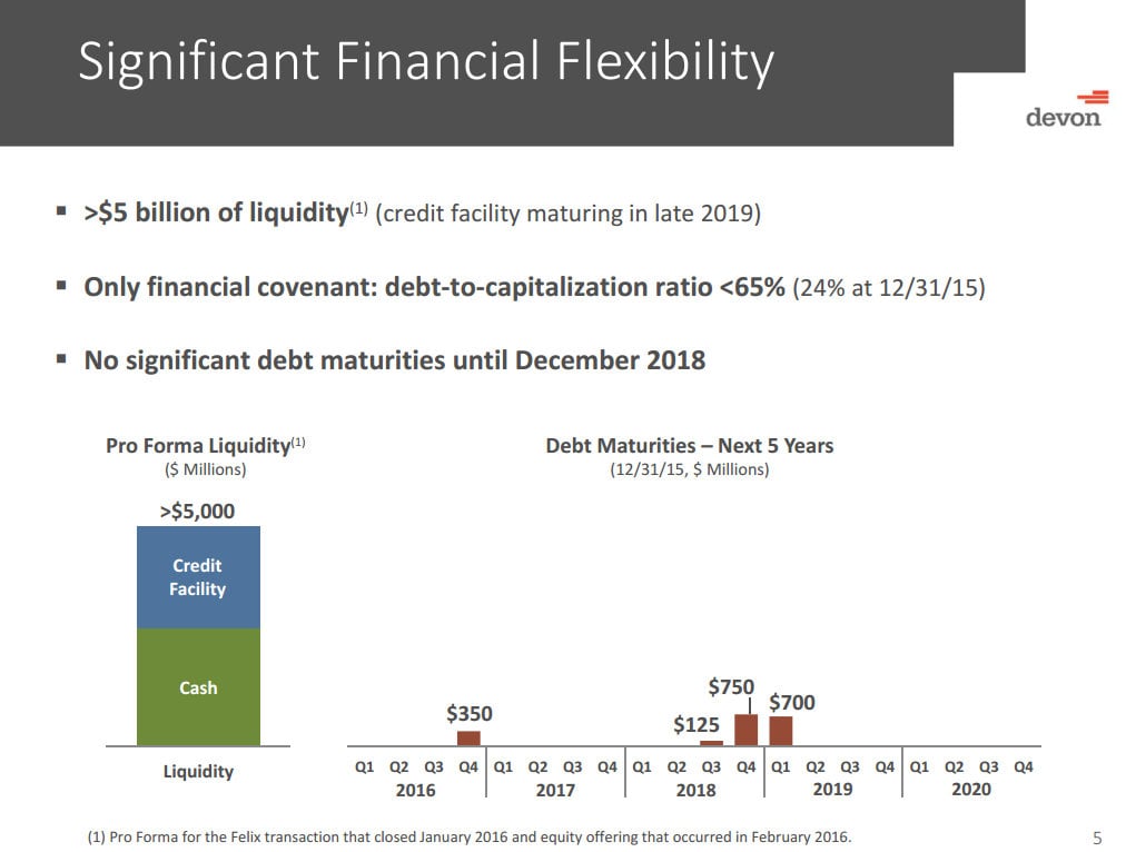 Devon Energy has significant financial flexibility when compared to Chesapeake Energy. As the following slide shows, it has a mountain of cash and liquidity, but very few debt maturities on the horizon.