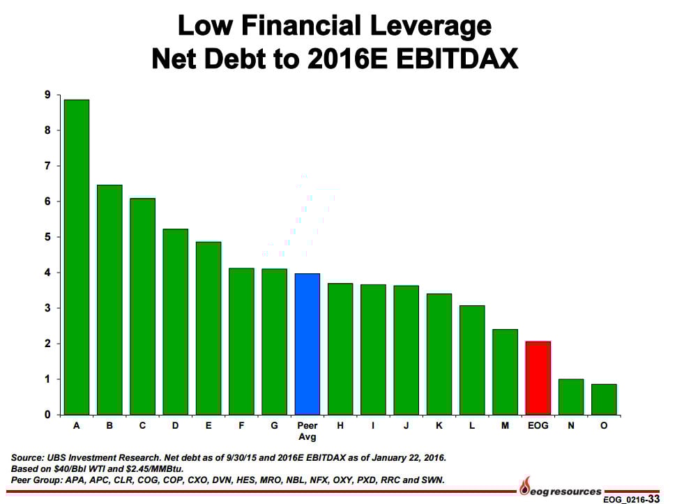 Sticking with the strong balance sheet theme, EOG Resources has also maintained a strong balance sheet amid the oil market downturn, with the company projected to have the third lowest leverage ratio in its peer group this year: