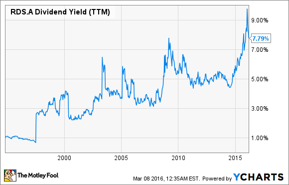Royal Dutch Shell (NYSE: RDS-A)(NYSE: RDS-B) has always been an outsized dividend payer. From 2011 to 2014, its annual yield averaged roughly 5%, almost double that of its most comparable competitor, ExxonMobil (XOM +0.48%). Since oil started falling over 18 months ago, however, that yield has been pushed up to levels as high as 9%.