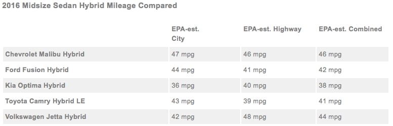 When it comes to EPA fuel economy, the Malibu Hybrid beats almost all of its main rivals. Its official EPA ratings are 47 miles per gallon in the city, 46 miles per gallon on the highway, and 46 miles per gallon "combined".