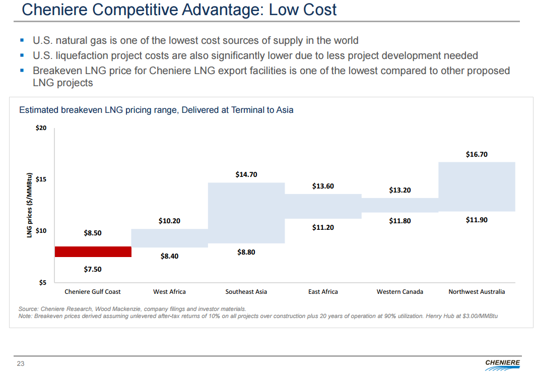 The lack of these projects on the table today means that there could be an opportunity to fill LNG demand several years from now, and Cheniere's construction and feedstock costs have made it one of the low cost options out there to meet future demand.