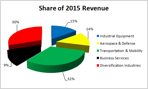 A look at Dassault's end markets in 2015 shows broad-based industrial exposure, so it's hard to argue that Dassault isn't affected by the economic cycle. Incidentally, "diversification industries" is just a catchall definition for everything that doesn't fit in the other categories, including things like construction, consumer goods, process and utilities, marine etc.