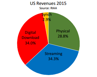 Recently, the Record Industry Association of America, or colloquially the RIAA, released its year-end 2015 analysis of the music industry. As this section's heading not-so-subtly hints, the RIAA report confirmed that 2015 saw revenue from digital streaming services eclipse digital download revenue as the largest revenue source for the music industry (see graphic).