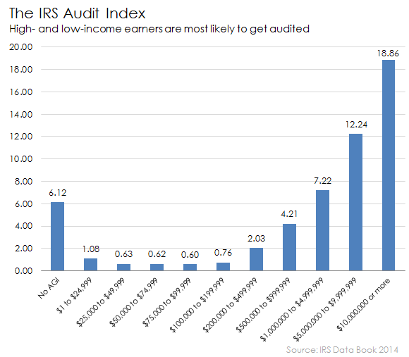 Those who reported no adjusted gross income had a roughly 1 in 20 chance of an audit, while those who earned more than $10 million in adjusted gross income had a roughly 1 in 6 chance.