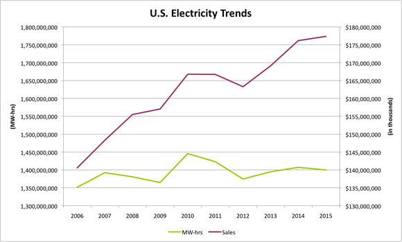 To put this data another way, total electricity sales rose 26.2% between 2006 and 2015, while electricity consumption rose just 3.6%. To be fair, that 2.6% compound growth rate in overall electricity costs is only slightly higher than the rate of inflation, so that growth rate isn't so shocking.