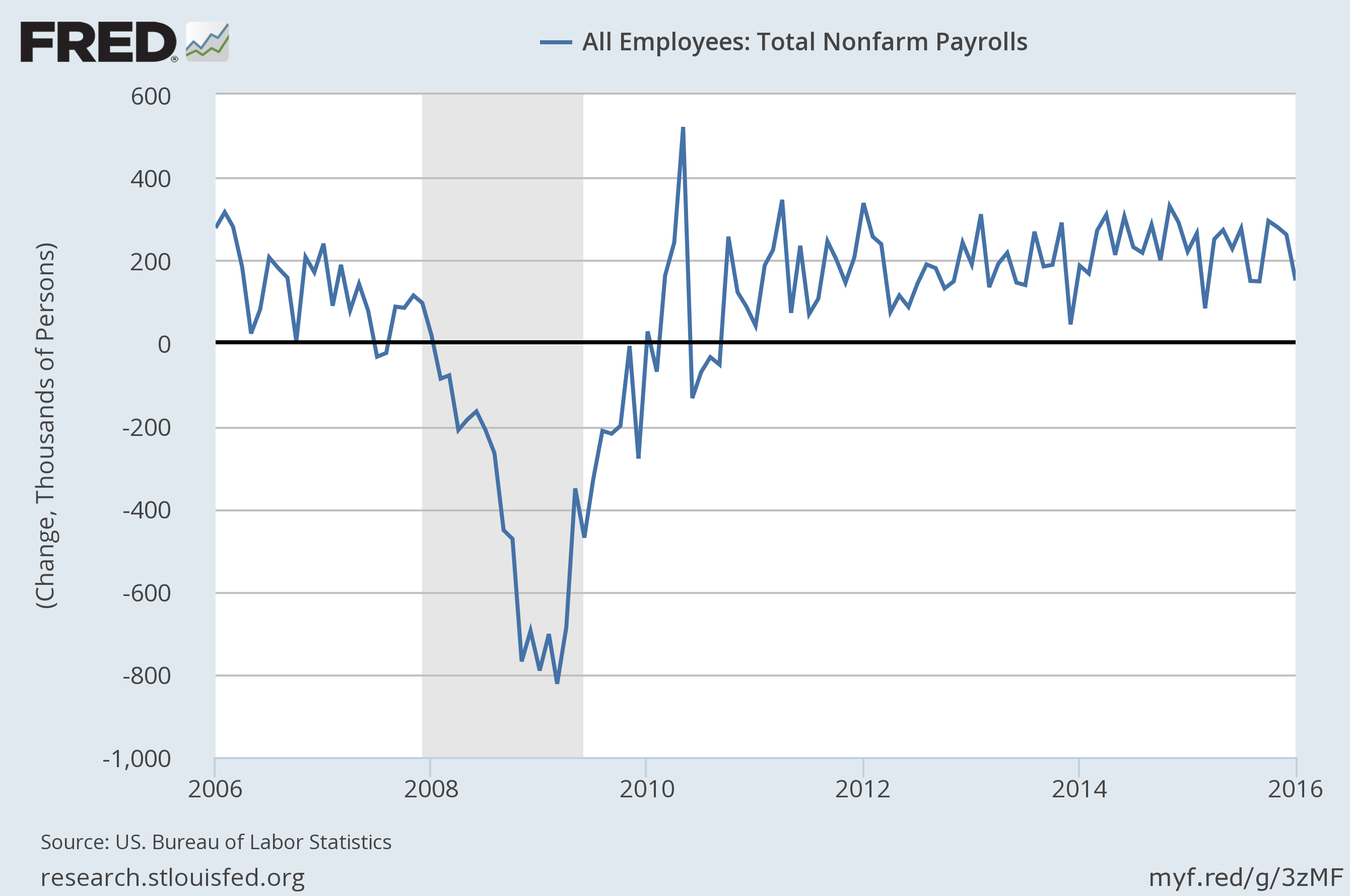 Monthly job growth. Source: Federal Reserve Economic Data.