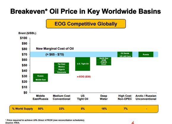 More crucially, EOG Resources has a low cost of production. Research firm PIRA estimates that EOG's breakeven oil price is $30 per barrel versus U.S. tight oil's general breakeven of $40-$65 per barrel. If ExxonMobil were to purchase EOG, it would instantly add billions of low-cost potential reserves and increase its production by around half of million BOE per day, too.