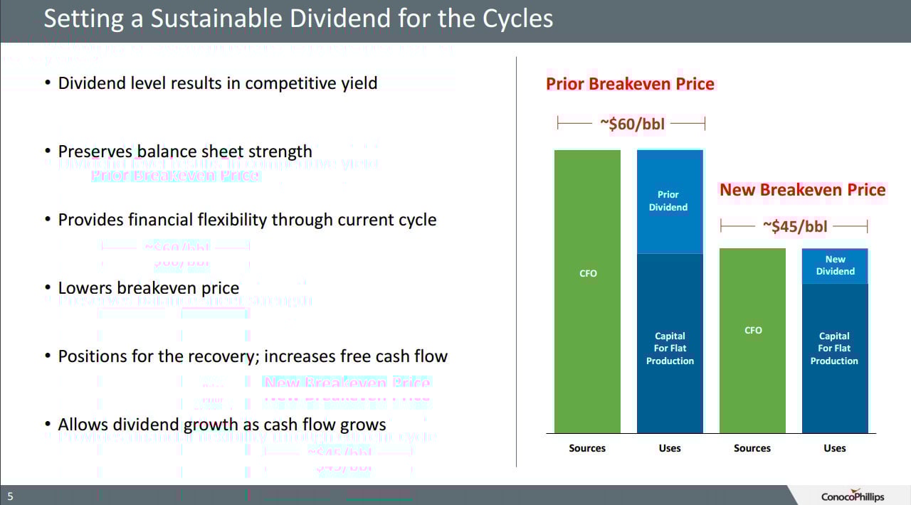 This decline in prices has a direct impact on its cash flow, which affects not just its ability to maintain and grow its production but its dividend as well. It's because prices have been so weak that it has been forced to eliminate growth-focused spending and reduce its dividend in order to better balance cash flow with those two outflows: