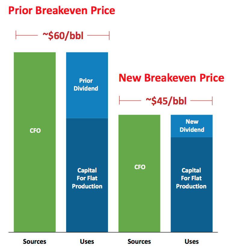 The biggest contributor is a lower dividend obligation after the company trimmed its quarterly payout to $0.25 a share from $0.74. That represented its first dividend cut since 1991. The move should easily free up $4.4 billion in cash flow. In response to the cut, CEO Ryan Lance said he thought it was "prudent to plan for lower prices for a longer period of time."