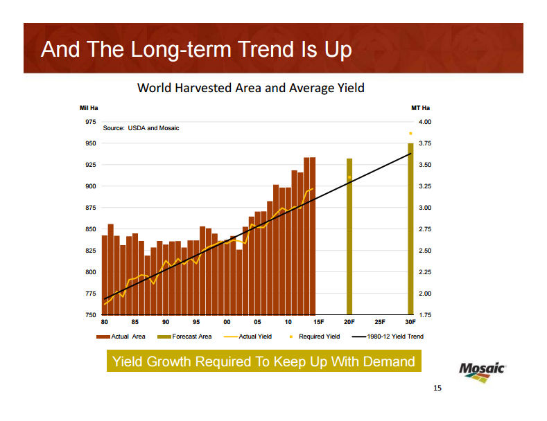 The important information to glean from this chart is that the swift growth in farmland that occurred from 2000 or so is set to flat line over the next several decades. That means higher yields will be needed to supply the projected global population. This is why the yellow line is expected to keep going up even though world harvest area growth slows down. Mosaic's answer to increasing crop yields is by adding more fertilizer, which works. But Monsanto believes there's another way -- better seeds and pesticides.