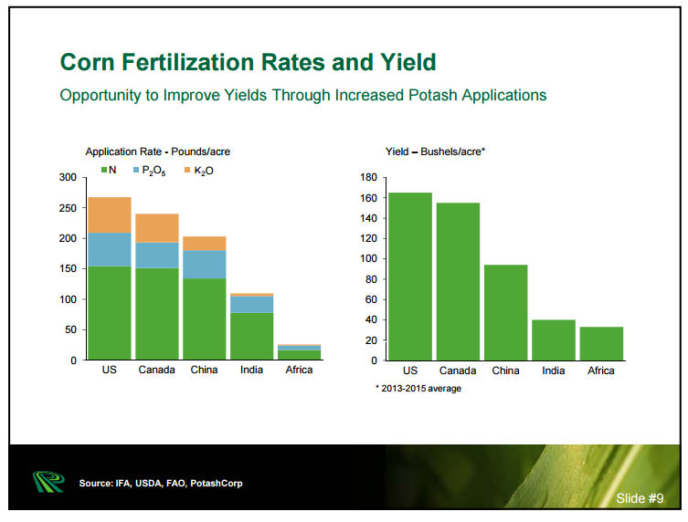 Notice how far ahead the United States and Canada are. Granted, both of these nations make extensive use of fertilizers (shown on the left-hand side), which highlights the potential for Potash and Mosaic, but that's not the only modern farm technology being put to work in these developed markets. So getting other parts of the world up to snuff is going to be a mixture of things, including better seeds and pesticides.