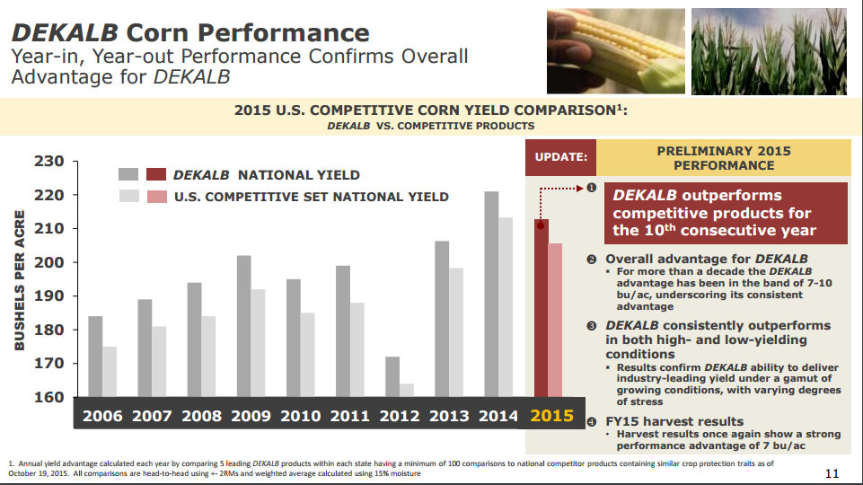 Finally we get to a chart from Monsanto. The chart is a year-by-year comparison of Monsanto's Dekalb seed brand versus competitive products in the United States. It's pretty impressive.