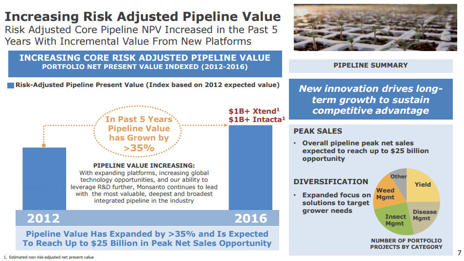 There are two things worth noting on this chart. First is the pie chart on the right-hand side, which shows the company's diversification in R&D. Seeds are important, but Monsanto really does a lot more than that. The second takeaway is that in just a few years, Monsanto's investment in research has led to a large increase in the expected value of its pipeline products. In other words, R&D is making Monsanto's future look increasingly bright while it helps to meet the world's growing need for more food.