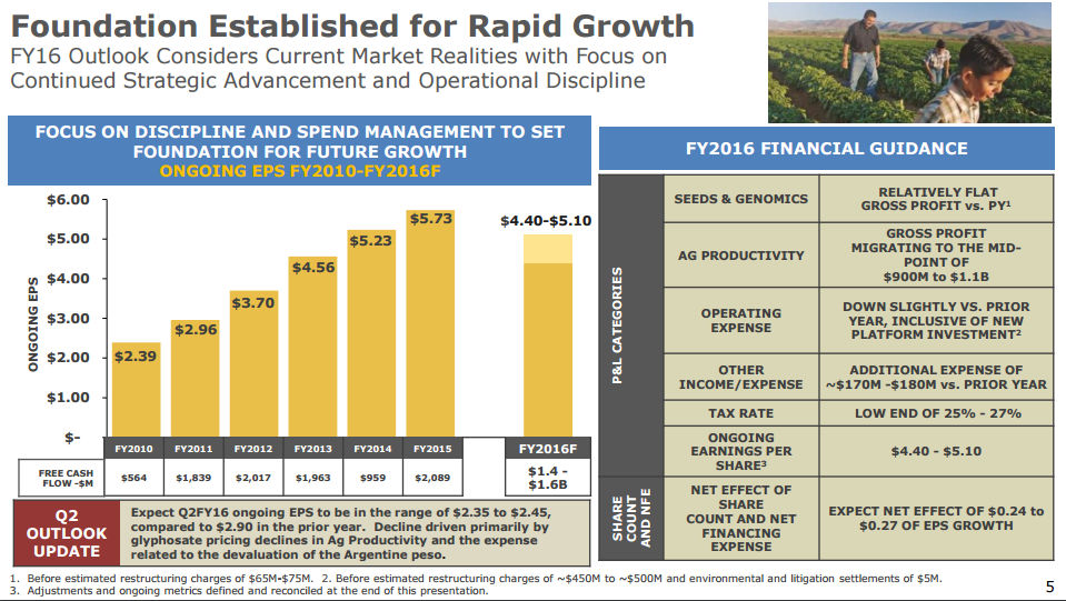 The bad news, however, is that 2016 isn't likely to be a good year for the agricultural technology company. In fact, the earnings guidance of $4.40 to $5.10 a share it recently provided is down from January when it expected earnings to be between $5.10 and $5.60 a share. So not so good right now, but that could open up a buying opportunity since the shares are down around 25% over the past year or so.