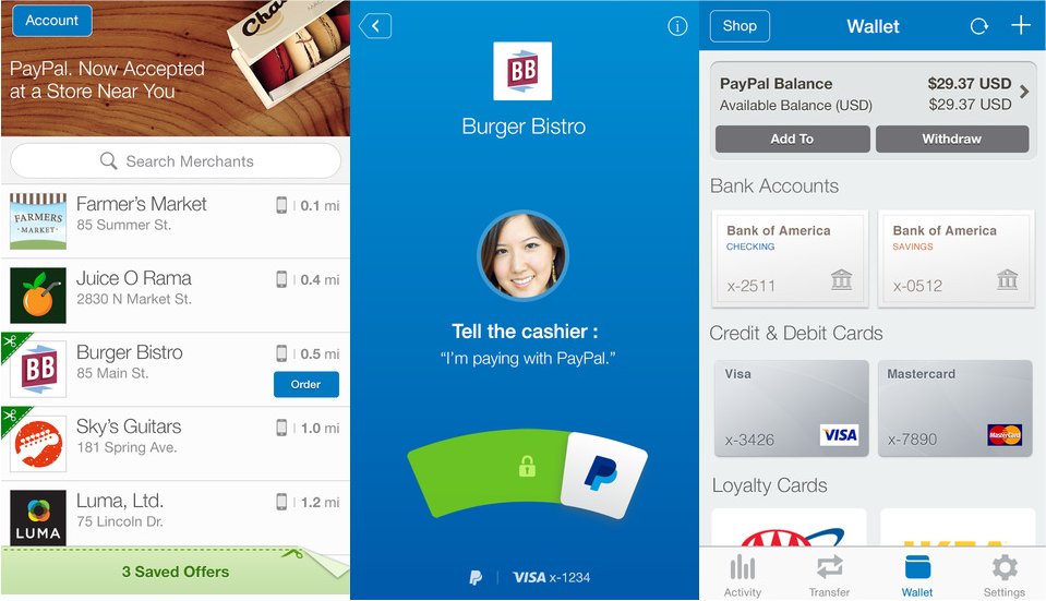 Mobile payment systems still use a wide variety of technologies. PayPal was a big proponent of using Bluetooth beacons to automatically sync with in-store mobile devices for payments and promotions. Square and Google generally favored cloud-based solutions which pulled synchronized payment data from the Internet.