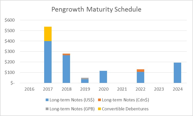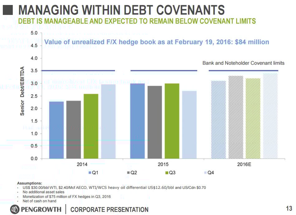Pengrowth is in a bit of a better position because it doesn't have to part with core assets in order to stay afloat. Furthermore, given its sub-3.5 times EBITDA ratio and the fact it's not projected to breach its covenants this year, Pengrowth is at least a safer oil stock than Penn West is right now. So, while it has little room for error, it still has a bit more breathing room than some of its other peers.