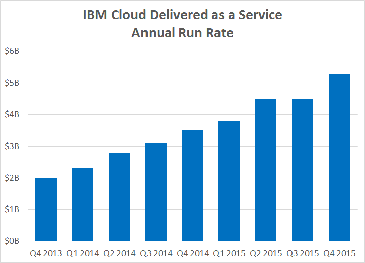 In 2015, IBM reported $10.2 billion of cloud revenue, up 57% on an adjusted basis. This number isn't directly comparable to those of other cloud infrastructure providers like Amazon and Microsoft, because IBM's cloud revenue includes hardware, software, and services. A more comparable number is IBM's cloud delivered as a service annual run rate, which reached $5.3 billion at the end of 2015.
