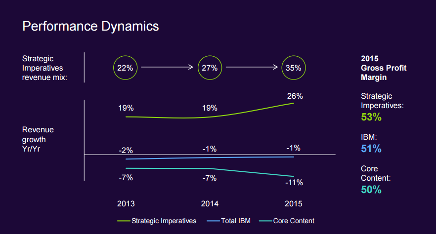 In 2015, revenue from strategic imperatives accounted for 35% of IBM's total revenue, and despite their size, growth is accelerating. The strategic imperatives grew revenue by 26% last year, adjusted for currency, while the rest of the business shrank.