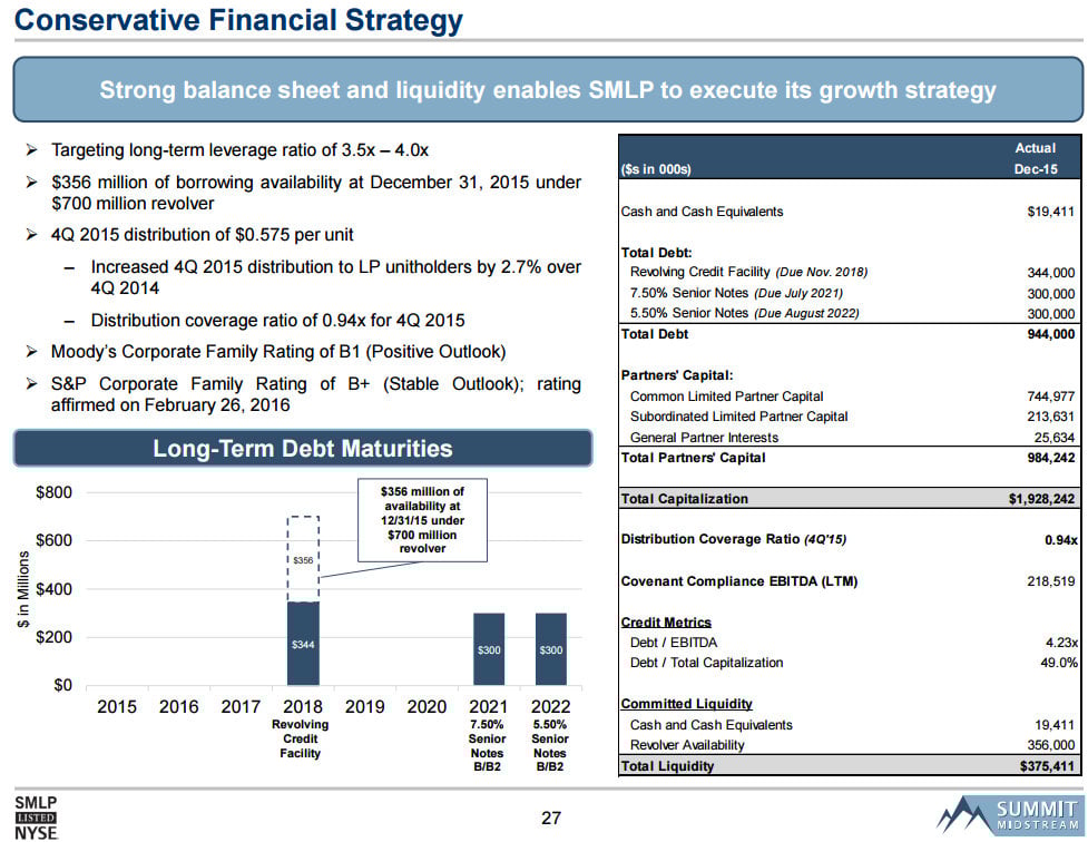 The slide below gives investors a pretty good snap shot of Summit Midstream Partners' balance sheet and credit metrics: