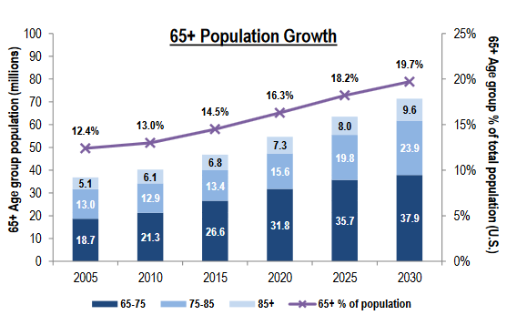 Second, and most importantly, the demographics indicate that the future will hold a lot of demand for senior housing properties. The U.S. population is aging rapidly, and with millions of baby boomers getting ready to retire, there will be a tremendous need for senior housing. In fact, during the 20-year period from 2010 to 2030, the 65-plus population is expected to grow by 78%.