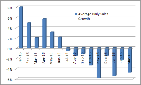 A look at average daily sales growth by month shows how the improvement seen in December failed to carry through into MSC Industrial's second quarter. This is somewhat disappointing given that Fastenal and Grainger had both reported relative improvement in early 2016.