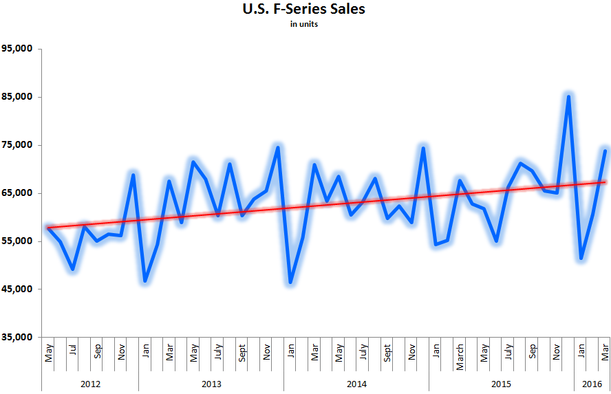 While Ford has stepped into the lead, chances are GM will take back its top spot in the U.S. market next month. Ford sold 254,711 vehicles last month in the U.S., an 8% gain over last year's result and its best March performance since 2006. Ford's SUVs and trucks again led the charge, with its combined SUV sales up 13% in March to 72,872 units. Sales of the Edge were up nearly 50%, and the Escape and Explorer followed with 8% and 4% gains, respectively. Meanwhile, sales of the F-Series topped 70,000 units last month, the first time since 2007 the truck reached that level of sales this early into a year.