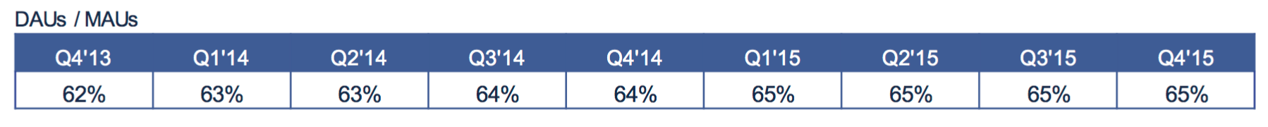 Arguably the most useful way to check on Facebook user engagement is by simply dividing the social network's reported daily active users, or DAUs, by its monthly active users, or MAUs. The resulting percentage is the social network's user base's engagement rate for a given quarter.