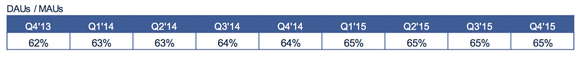 Looking at Facebook's percentage of MAUs using the platform on a daily basis, engagement appears healthy recently. A whopping 65% of MAUs use Facebook every single day. In other words, more than 1 billion of Facebook's nearly 1.6 billion MAUs are also DAUs.