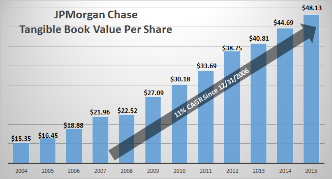 For long-term investors, I think a great place to see the bank's fundamental performance is in its tangible book value per share from before, during, and since the financial crisis. This number is a good proxy for the ability to generate returns and increase return on equity without the noise from short-term market forces. This chart shows JPMorgan's tangible book value per share each year from 2004 to 2015.