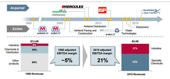 So what: Ashland is a chemicals maker and also owns Valvoline (about 40% of revenues), which it plans to spin off later this year. So the first thing you need to understand about Ashland is that it's a work in progress. Investors' perception of the spin off will likely have a notable impact on the stock as the date of the split nears. On that front, Ashland completed its purchase of Oil Can Henry's in early February, which augments the Valvoline business and should be a net positive for the spin off.