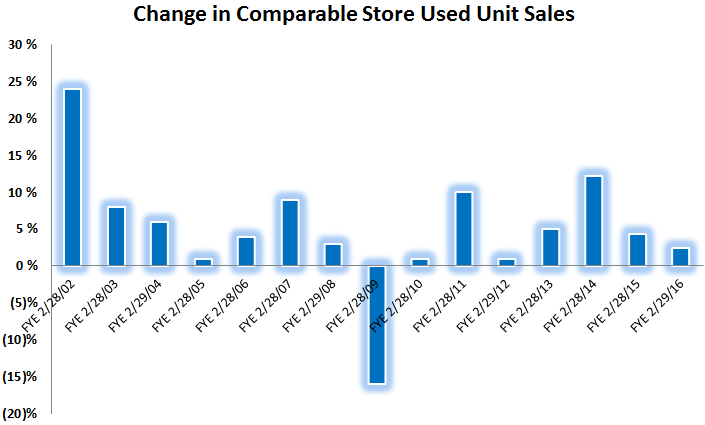 Also, looking at value returned to shareholders, CarMax repurchased 3.0 million shares of common stock during the fourth quarter, which brings the total to 16.3 million shares for $971.2 million during the fiscal year. At the end of the fourth quarter, Feb. 29, 2016, CarMax had $1.4 billion remaining available for repurchase under its current program.