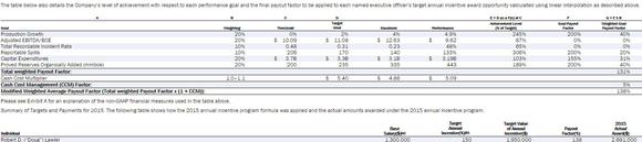 That said, the reason Lawler chose to drill to grow was because that's what he is paid to do. It's part of the company's performance-based annual incentives program, which can be found on page 38 of its most recent proxy statement. A portion of that page is shown on the screen shot below, which shows that items such as production and organic reserve growth have a higher combined weighting than safety or earnings goals: