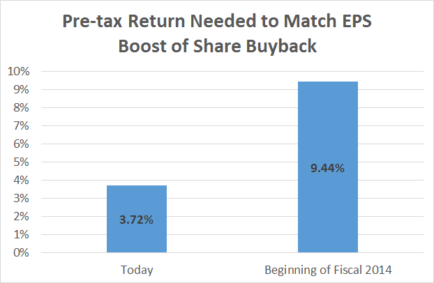 Let's look at it another way. At the beginning of fiscal 2014, a $500 million buyback, if it could be done all at once, would have boosted EPS by 6.9%. Today, the same buyback would boost EPS by only 2.5%, thanks to the higher stock price. What if that $500 million were invested back into the business? Using NVIDIA's fiscal 2016 tax rate, what pre-tax rate of return would be necessary to achieve the same EPS increase?