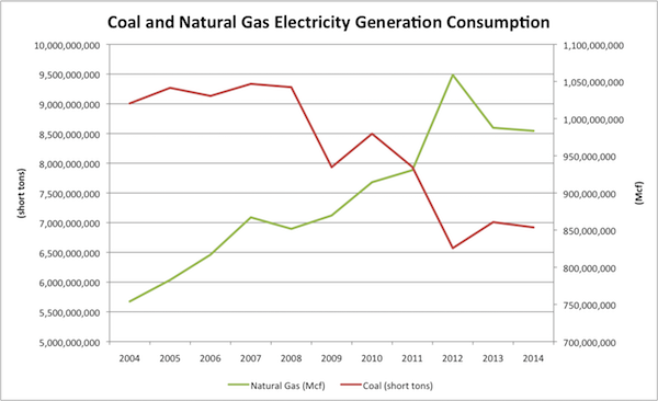 As recently as 2006, coal generated 49% of U.S. electricity, compared to 20% from natural gas. In 2015, coal had fallen to 33% and natural gas was up to 33% as well.