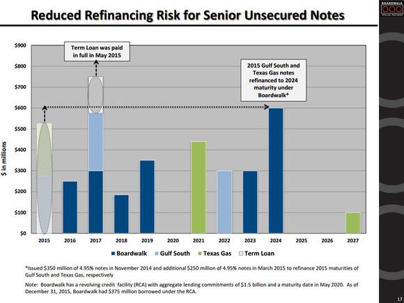 In addition to funding these capital needs Boardwalk Pipeline Partners has maturing debt to contend with before these growth projects start delivering increased cash flow. As the chart below shows, the company has more than $800 million in upcoming debt maturities that need to be addressed over the next two years: