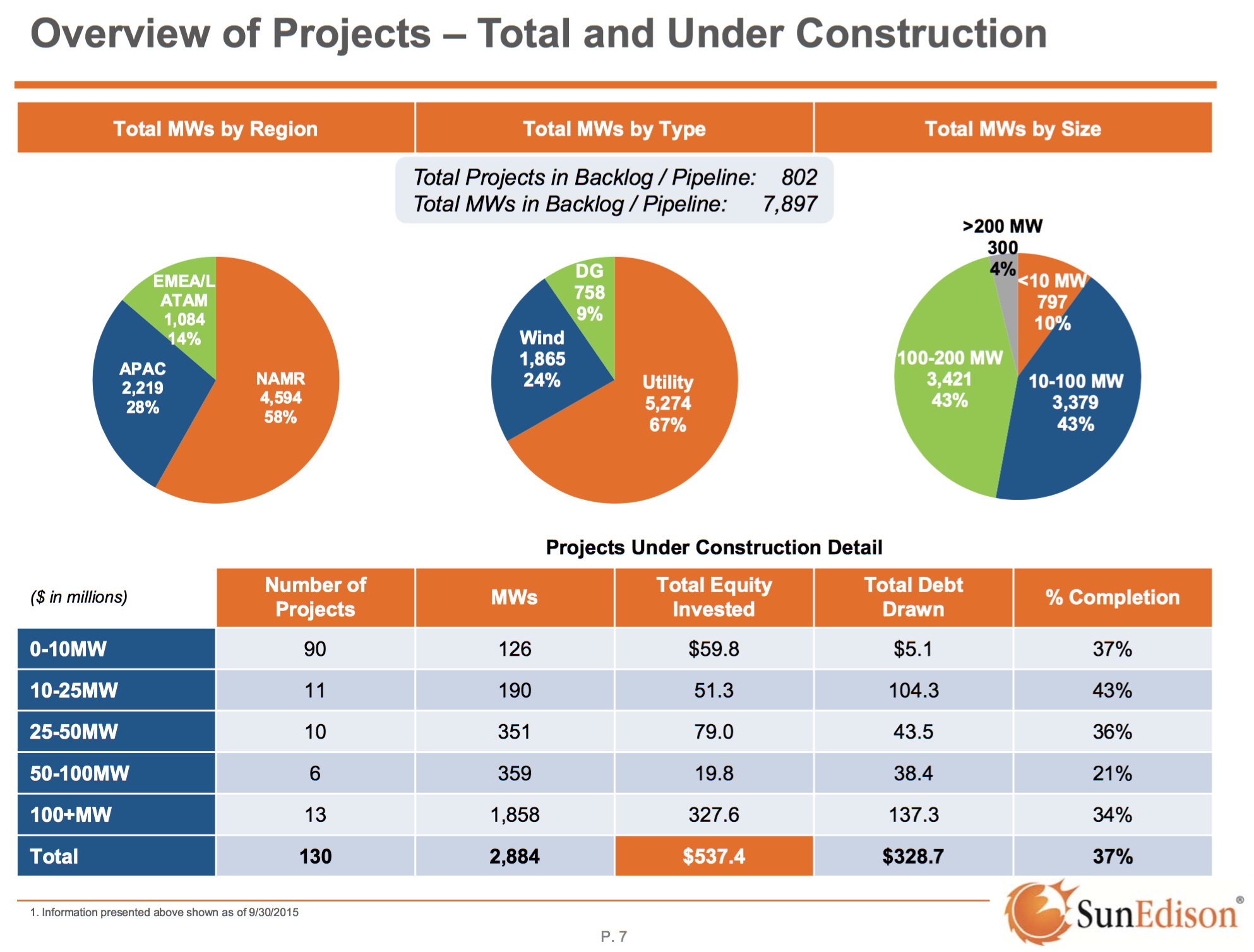 As of early January -- the last time investors heard from management in a meaningful way -- the company had 2,884 MW of projects under construction around the world and had invested $537.4 million of equity and taken out $328.7 million in debt on those projects, or $866.1 million. And that $866.1 million cost only got these projects to 37% completed.