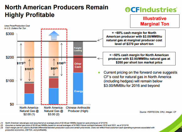 One of the reassuring things about fertilizer and the agricultural industry is that demand is pretty inelastic. We all gotta eat, and rising populations and incomes around the world mean more food needs to be put on tables. The problem for fertilizer companies is getting the supply side of the equation right. A couple of years of big harvests have brought down the price of food products, which has led to lower fertilizer demand. What's promising about CF Industries, though, is that the company has remained profitable through the recent downturn. As a North American nitrogen fertilizer producer, it enjoys a massive advantage over global suppliers because of cheap natural gas and one of the better looking balance sheets in the business.