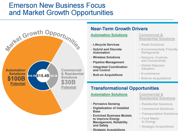 As a company that's regularly paid and increased its dividend for more than 57 years, Emerson isn't taking part in it first rodeo. The company has worked its way through multiple industry cycles, all the while keeping an eye on maintaining strong cash flows that have led to its dividend streak of more than half a century. At the same time, it's not exactly sitting on its laurels to wait for the market to pick back up again. Emerson CEO David Farr has stated that the company plans to sell its network power segment as well as its motors and drives and power generation segments. This move will lead to a company that's focused more on industrial automation and residential products, two segments the company believes will lead to higher margins and some extra cash to make acquisitions in this part of the business.