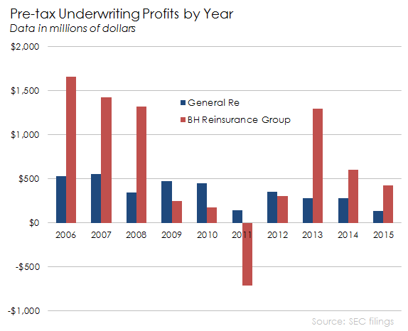 Reinsurance is a major contributor to Berkshire. In the past 10 years, General Re and BH Reinsurance have generated nearly $10.3 billion in pre-tax underwriting profits. The duo are the main drivers of Berkshire's insurance float, which generated $47.5 billion in pre-tax investment profits in the same 10-year period.