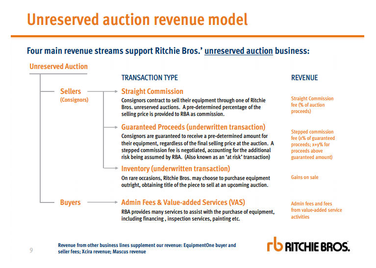 The bulk of Ritchie Bros. business is structured as simple auctions. It just gets a percentage of the sales price for doing the auctioning. However, the company also handles what it calls "at risk" auctions. In these situations, the auctioneer guarantees the seller a price for its equipment regardless of the final outcome of the auction. Although this results in higher commissions for Ritche Bros., it also means there's a chance of taking a loss, too.