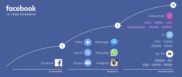 The CEO's keynote was built around the idea of the company's having a 10-year road map. That starts with its core platform and then branches into its other apps such as Messenger, WhatsApp and Instagram. Beyond that, it moves into delivering global connectivity and emerging platforms such as virtual and augmented reality.