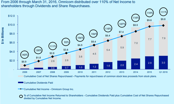 - Omnicom also maintained its long-standing streak of returning more than 100% of net income to shareholders through dividends and repurchases: